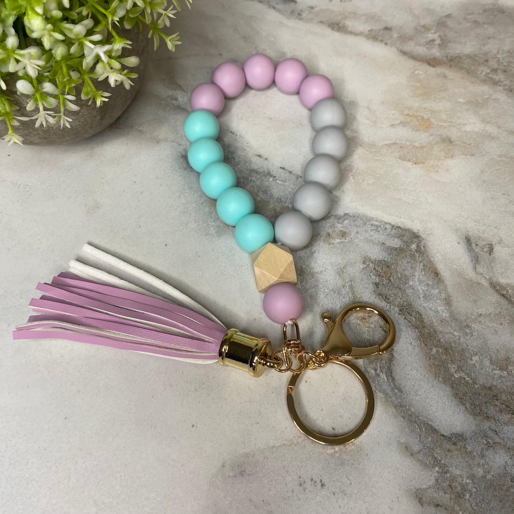 Silicone Bracelet Keychain with Wood Bead & Tassel - Lavender & Aqua